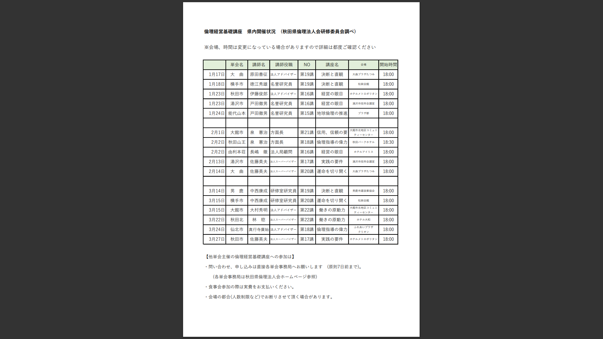 「倫理経営基礎講座」の各単会の開催状況(秋田県倫理法人会 研修委員会調べ)のお知らせになります。