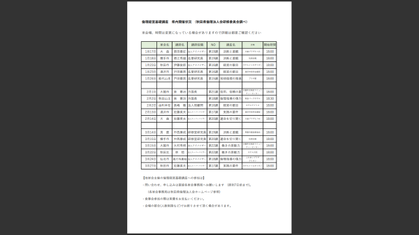 現在、基礎講座の案内は、各単会内の対象者にのみにされていますが、研修委員会が各単会での開催状況を調べ、ホームページにて情報提供して参りますので、各自で主催単会にお問い合わせ頂ければと存じます。